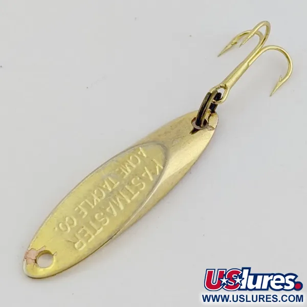 Superficies chapadas en oro definen el perfil angular distintivo de esta cucharilla de 3,5 g (1/8 oz). Con una longitud de 3,5 cm (1 1/2"), el señuelo muestra el sello de Acme Tackle Co. claramente grabado en su cara. Los biseles cortados con precisión en cada lado facilitan su uso en aguas profundas como pilker o para lanzar en corrientes fuertes. Presenta ligeras marcas superficiales cerca del ojal, revelando pequeños puntos del metal base, lo cual concuerda con su estado de conservación 4/5. Se mantiene una alta visibilidad gracias al acabado dorado reflectante, que permanece brillante en la mayor parte de la superficie. Código de producto 24510.