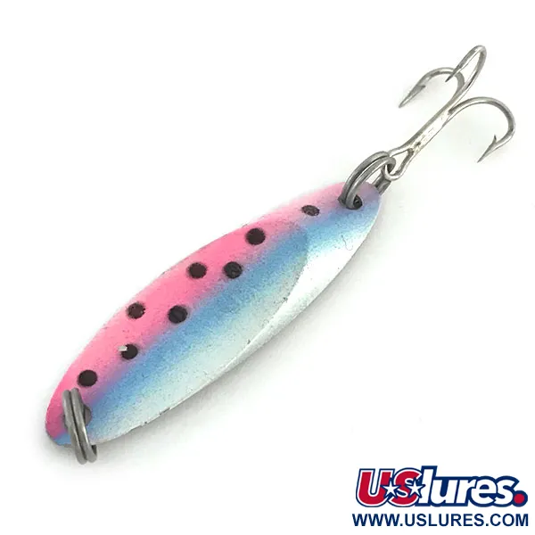 El baño de níquel proporciona una base de altos reflejos para el patrón de color Trucha en esta cucharilla ondulante de 7 g (1/4 oz). Fabricada en EE. UU. bajo el código de producto 9340, el diseño original de Acme utiliza una aleación metálica específica que garantiza que el equilibrio se mantenga estable durante la recogida o el descenso. El propio patrón Trucha muestra vibrantes degradados rosas y azules a lo largo del borde superior, puntuados por una serie de motas negras que imitan a un pequeño pez pasto. Con una longitud de 4,5 cm (1 3/4 pulgadas), este ejemplar es una opción versátil para quienes buscan peces depredadores en aguas profundas o corrientes fuertes donde se necesita un perfil denso y aerodinámico. El acabado de la pintura y el metal se encuentran en perfecto estado, con una calificación de 5/5. El equipo se completa con un anzuelo triple resistente unido mediante anillas abiertas reforzadas en ambos extremos.