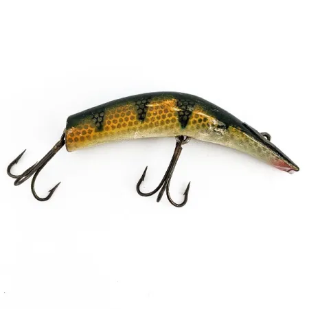 Un patrón de escamas pintado a mano transiciona de un verde bosque profundo en el lomo a un cálido amarillo miel en los laterales de este Kautzky Lazy Ike de 7 cm (2 3/4"). Su construcción en madera identifica esta pieza como un modelo de producción temprana, anterior al cambio de la empresa al plástico en 1960. Con el código de producto 21910, el señuelo pesa aproximadamente 7g (1/4oz) y presenta la icónica forma de cuerpo curvado que define la historia de la marca. Joseph Kautzky, un inmigrante austríaco y antiguo armero, aportó un nivel de precisión a estos señuelos hechos a mano que les valió una reputación como obras de arte funcionales. El herraje consta de dos anzuelos triples en el vientre y la cola, fijados mediante cáncamos de rosca de época. En cuanto a su conservación, el estado es un claro 4/5, con las marcas triangulares oscuras de los flancos manteniéndose nítidas y diferenciadas sobre la base amarilla. Cada línea y curva del tallado evoca el taller de Iowa donde la Kautzky Manufacturing Company comenzó su trayectoria en la fabricación de aparejos de pesca en la década de 1930.