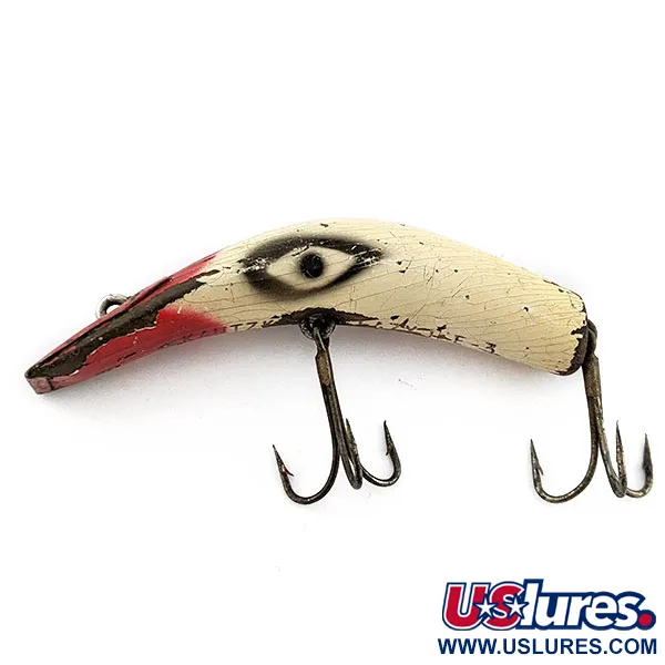 Un cuerpo curvado distintivo define la silueta de esta pieza de madera de 2 3/4" (7cm), un sello distintivo de la artesanía estadounidense de mediados de siglo. Con un peso de 1/3oz (9g), el Kautzky Lazy Ike 3 lleva el código de producto 20123 y presenta un cuerpo de color crema acentuado por una cara roja intensa y grandes ojos pintados tipo diana. La superficie muestra una red de finas grietas en el acabado con carácter y un desgaste significativo de la pintura debido al uso real, lo que resulta en una clasificación de estado de 3/5. Centrado a lo largo del lateral, el sello original de fábrica identifica claramente su origen y número de modelo. Dos anzuelos triples montados en el vientre muestran una oxidación profunda y envejecimiento, reflejando la larga historia de este señuelo fabricado en Iowa.