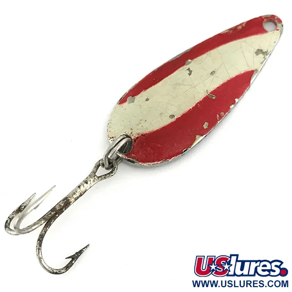 Franjas diagonales rojas y blancas definen la cara de esta cucharilla Keystone, un sello distintivo del diseño de señuelos de mediados de siglo en EE. UU. Con un peso de 3/16oz (5,5 g), el cuerpo de metal mide 1 3/4" (4,5 cm) y presenta una forma de lágrima tradicional diseñada para el lance. Este ejemplar, registrado bajo el código de producto 6934, tiene una calificación de estado de 3/5; la superficie pintada muestra el desgaste propio de la edad y pequeños desconchones que resaltan su historia en el agua. El reverso consiste en un niquelado que ha suavizado su tono con el paso de los años. Un único anzuelo triple está unido a la cola mediante una robusta anilla abierta, mientras que la cabeza cuenta con un ojal limpio para conectar un bajo de línea o un clip. A pesar de que el fabricante es desconocido, su elaboración refleja la calidad sencilla y duradera típica de los equipos de pesca americanos antiguos.