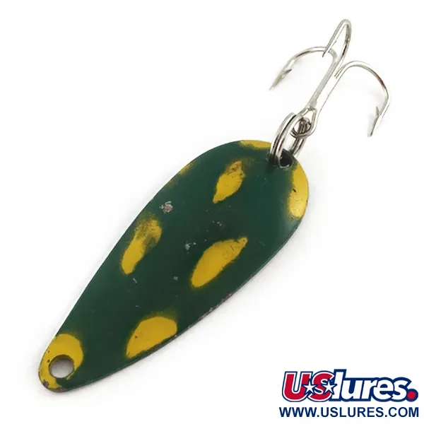 La pintura con patrón de rana en verde y amarillo resalta el perfil de esta cucharilla Keystone de 3/16 oz (5 g). Fabricado en EE. UU., el señuelo mide 1 3/4" (4,5 cm) y está catalogado bajo el código de producto 23494. El acabado pintado muestra algunos signos naturales del paso del tiempo, otorgando una calificación de estado de 4/5 a este ejemplar bien conservado. Incorpora una anilla abierta resistente y un anzuelo triple brillante en la parte posterior, mientras que la parte delantera está acabada con un sencillo ojal de sujeción circular.