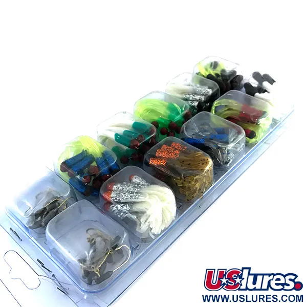 Dividido en diez compartimentos distintos, este organizador sellado de fábrica contiene una selección completa de vinilos de 2" (5 cm) con faldillas estilo octopus. El surtido presenta una gama de colores diversa que incluye variantes en azul, rojo, amarillo, verde, plata, oro, negro y marrón. Cinco celdas específicas contienen señuelos reactivos a los rayos UV, diseñados para aumentar la visibilidad en condiciones de poca luz o en capas de agua profundas. Fabricado en EE. UU. por Creme, el kit está configurado específicamente para la pesca al jigging. Cada compartimento contiene 10 Maxi Tails individuales, lo que suma un total de 100 señuelos junto con 19 cabezas plomadas surtidas ubicadas en las secciones superiores de la bandeja. Identificado con el código de producto 8368, el conjunto incluye tanto colores sólidos de alto contraste como opciones con purpurina fina para un destello adicional. Como artículo sin usar en su embalaje original, el ejemplar recibe una calificación de estado de 6.