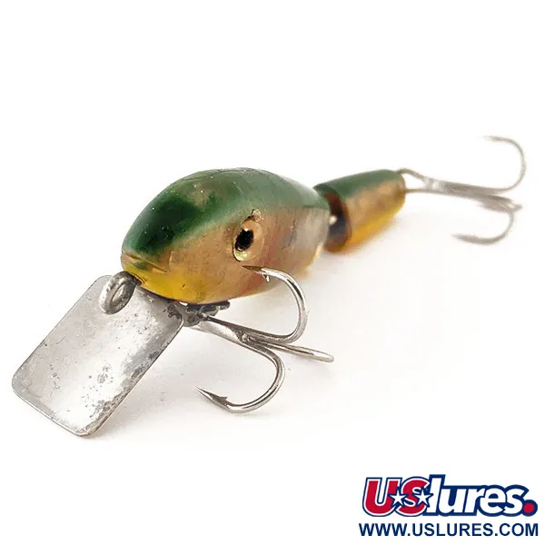 Con una longitud de 7 cm (2 3/4"), el cuerpo articulado en dos secciones de este Kmart Kresge #370 luce un acabado clásico Amarillo / Verde típico de las importaciones japonesas de mediados de siglo. Este señuelo de tipo suspendido, identificado con el código de producto 12464, está diseñado para un rango de profundidad de 0,6 a 2,1 m (2-7 pies), lo que lo convierte en una opción versátil tanto para lance como para curricán. Un peso de 7 g (1/4 oz) proporciona el equilibrio necesario para su profundidad de suspensión prevista. Al observar de cerca los herrajes, el gran babero metálico troquelado está fijado de forma segura con tornillos visibles, sujetando dos anzuelos triples en tono plateado. Los ojos de color ámbar y la transición suave del vientre amarillo brillante al lomo verde oliva son rasgos bien conservados. En un estado de conservación 4/5, el ejemplar muestra ligeras marcas de su historia manteniendo todos sus componentes originales y la intensidad de la pintura. Su construcción refleja la disposición específica de herrajes común en la línea de pesca de Kmart fabricada en Japón.