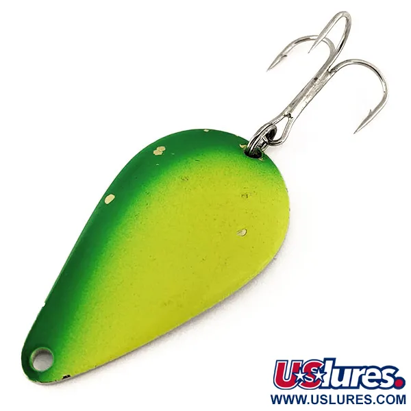 Con una longitud de 5,5 cm (2 1/4"), esta cucharilla Acme presenta un acabado degradado vibrante que transita de un verde intenso en el borde exterior a un amarillo brillante en el centro. Con un peso de 21 g (3/4 oz), el Acme K.O. Wobbler UV (Código: 12258) es un señuelo consistente fabricado en EE. UU. para la pesca de diversas especies depredadoras. La característica más notable de este modelo es su recubrimiento especial reactivo a los rayos UV; al exponerse a la luz ultravioleta, el cuerpo amarillo-verde emite un intenso brillo fluorescente para mejorar la visibilidad en entornos oscuros o aguas tomadas. Su cuerpo metálico clásico en forma de lágrima está equipado con un anzuelo triple reforzado en tono plateado. El señuelo está en condición 4/5, mostrando una pintura bien conservada y herrajes limpios. Su diseño busca replicar el perfil y la presencia de un pez pasto en movimiento durante una recogida lineal.