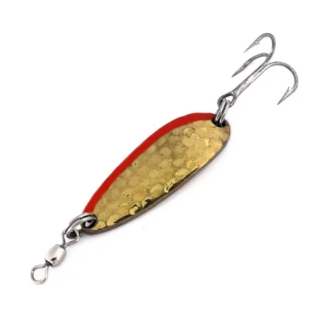 En la parte inferior de latón liso está grabado claramente el nombre "LUHR JENSEN KROCODILE", identificando esta cucharilla de 4 cm (1 1/2") como un básico para los entusiastas del equipo ligero. Este ejemplar de 9 g (1/3 oz) presenta un distintivo acabado de latón martillado en su lado convexo, acentuado por una llamativa franja naranja a lo largo del borde exterior. Este modelo específico, con código de producto 10184, está diseñado para una utilidad versátil, ya sea lanzando desde un muelle o recorriendo las orillas en busca de truchas y peces de pequeña talla. El montaje incluye una resistente anilla abierta unida a un anzuelo triple en la cola y otra anilla abierta conectada a un emerillón de barril en el morro para evitar la torsión de la línea. Las superficies están excepcionalmente limpias y bien conservadas, con una calificación de 5/5. Fabricada en EE. UU., el cuerpo de metal de calibre grueso de este clásico de Luhr Jensen asegura que mantenga su acción incluso en aguas con corriente.
