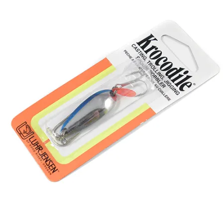 Una llamativa franja azul recorre el borde de esta cucharilla ondulante con acabado en níquel, proporcionando un fuerte contraste contra el cuerpo de metal pulido. Luhr Jensen fabricó este modelo Krocodile, catalogado bajo el código de producto 2055, para una gran variedad de entornos, desde lagos alpinos hasta muelles costeros. Con un peso de 1/3 oz (9 g) y una longitud de 1 1/2" (4 cm), la cucharilla está construida con un perfil estrecho y grueso que ayuda a alcanzar grandes distancias en el lance. Viene equipada con un distintivo atractor de plástico rojo unido a la anilla abierta trasera, posicionado justo al lado del anzuelo triple para servir como activador visual. El diseño está pensado para el lance, curricán o jigging, reflejando la herencia de la marca de Hood River, Oregón. Este ejemplar no ha sido usado, se mantiene sellado en su blíster original que ha protegido el niquelado y la integridad de la pintura azul. La parte posterior de la tarjeta proporciona el contexto histórico de la marca y confirma su idoneidad para diversas condiciones de agua.