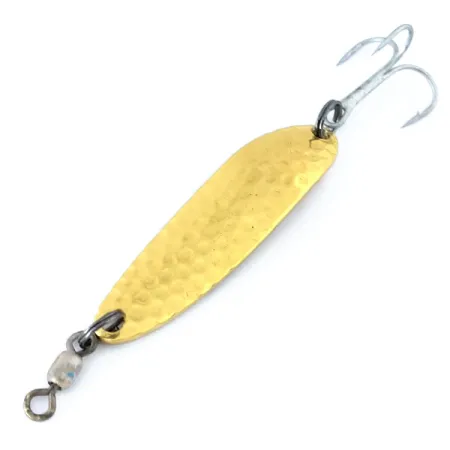 Las superficies de oro martillado como la de este Luhr Jensen Krocodile Die #3 son legendarias por captar la luz y atraer la atención a distancia en aguas profundas. Con el sello claramente grabado en el reverso liso 'KROCODILE DIE #3 LUHR JENSEN HOOD RIVER, ORE.', este ejemplar en particular, identificado con el código de producto 10855, proviene de las raíces históricas de la marca en Oregón, EE. UU. Con unas medidas de 5,5 cm (2 1/4") y un peso de 10 g (1/3 oz), su cuerpo denso y estrecho está diseñado específicamente para lances de larga distancia o para alcanzar profundidades mayores que las cucharillas de metal fino estándar. La cara frontal presenta una textura de hoyuelos profundos que maximiza el destello, mientras que el acabado pulido en tono latón se mantiene excepcionalmente limpio. Este señuelo está en una condición 5/5, mostrándose bien conservado con bordes afilados y un conjunto de quitavueltas y anzuelo triple original y limpio. Los pescadores suelen recurrir a estas cucharillas más pesadas para buscar salmones o truchas cuando se necesita un perfil compacto para penetrar la columna de agua de manera efectiva. Los anillas abiertas están apretadas y los componentes no muestran signos de desgaste, listos para una vitrina o un viaje de vuelta al río.