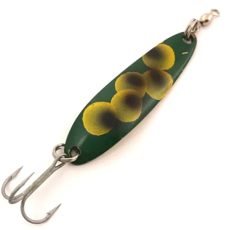 Acabada con un distintivo patrón Frog, esta cucharilla ondulante de 1/3 oz (10 g) presenta llamativas manchas amarillas con centros oscuros sobre un fondo verde bosque profundo. Con una longitud de 2 1/4" (5,5 cm), este ejemplar mantiene el perfil clásico de Luhr-Jensen, fabricado más estrecho y grueso que las cucharillas estándar para ayudar a alcanzar mayores distancias en el lance. El reverso del metal con tono de latón está claramente estampado con "KROCODILE", "DIE #3" y "HOOD RIVER, ORE", marcando su herencia de fabricación estadounidense. Este artículo específico, con el código de producto 3866, muestra ligeras y honestas marcas de manipulación en el reverso metálico, mientras que la cara pintada permanece notablemente limpia y vibrante, lo que le otorga una calificación de estado de 4/5. El montaje incluye un robusto anzuelo triple unido mediante una anilla abierta y un quitavueltas superior para ayudar a gestionar la torsión de la línea. Diseñado para especies que van desde el salmón de los Grandes Lagos hasta la trucha de lago, el Krocodile es ampliamente reconocido por un movimiento de balanceo constante que imita eficazmente a un pez pasto durante una recogida lineal.