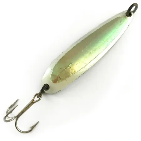 Con un peso de 19g (2/3oz), esta cucharilla ondulante de lanzamiento presenta un distintivo patrón de escamas holográficas que capta la luz con sutiles destellos rosas y verdes. La cara frontal está acabada en White / Pink Green Hologram, mientras que el reverso muestra el clásico sello "KROCODILE" junto con la marca Luhr Jensen y su histórica ubicación en Hood River, Oregon. Con una longitud de 6,5cm (2 1/2"), este modelo Die #4, identificado con el código 6131, está construido con un perfil más grueso y estrecho que las cucharillas estándar para facilitar lances de larga distancia. El equipo incluye un robusto anilla de llavero en la punta y un anzuelo triple de tono plateado en la cola. Este ejemplar se encuentra en una condición 5/5, con el acabado y las letras troqueladas en el reverso nítidas y legibles. Popular para la pesca de salmón o trucha, la distribución de peso específica del señuelo le permite alcanzar capas de agua profundas de manera efectiva. El reverso cromado proporciona un destello de alto contraste frente al frontal holográfico perlado.