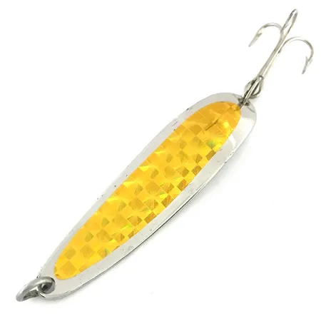 Con una longitud de 6,5 cm (2 1/2 pulgadas), la Krocodile Die #4 presenta una distintiva cinta prismática dorada aplicada sobre un acabado de níquel pulido. Esta cucharilla ondulante de 14 g (1/2 oz) de Luhr Jensen, identificada con el código de producto 8533, refleja la artesanía clásica de Hood River, Oregon. Su cuerpo estrecho y de perfil grueso es un sello distintivo del diseño Krocodile, pensado para alcanzar grandes distancias en el lance o mantener la profundidad en el curricán. En el reverso, el metal está claramente troquelado con el nombre y la ubicación del fabricante, resaltando las líneas limpias de la base de níquel. El montaje consta de una anilla abierta resistente y un anzuelo triple afilado, manteniendo su integridad original de fábrica. Calificada con un 5/5, este ejemplar se encuentra en excelente estado, conservando su alta reflectividad y la geometría nítida del patrón holográfico. La combinación de la parte posterior plateada y el frontal dorado ofrece un perfil de color versátil para los pescadores de depredadores.