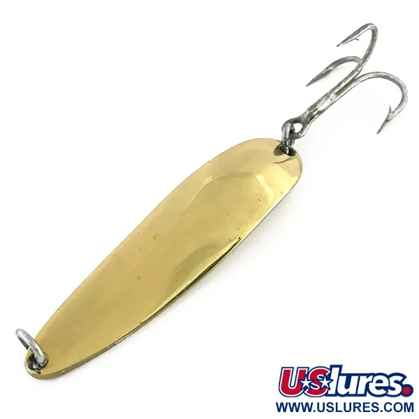 Con un peso de 2/3oz (19g), el perfil denso de esta cucharilla metálica es un sello distintivo de la filosofía de diseño de Luhr Jensen para alcanzar grandes distancias de lanzado. Con una longitud de 2 1/2" (6,5 cm), el cuerpo de latón de gran grosor está acabado en un Oro pulido y brillante que atrae la luz con eficacia. La parte posterior del señuelo presenta el icónico estampado profundo que lo identifica como una "KROCODILE" Die #4 de Luhr Jensen en Hood River, Ore., un lugar sinónimo de aparejos robustos del Noroeste del Pacífico. Este ejemplar específico, código de producto 8574, se encuentra en perfecto estado, con una calificación de 5/5. Los componentes son sólidos, incluyendo anillas abiertas originales y un anzuelo triple afilado diseñado para asegurar peces combativos como el salmón o la trucha de lago. Debido a su construcción estrecha y gruesa, es especialmente favorecida por los pescadores de espigón y orilla que necesitan cortar el viento. La forma clásica de la cucharilla proporciona un bamboleo fiable durante la recogida, que es una característica fundamental del diseño de este modelo.
