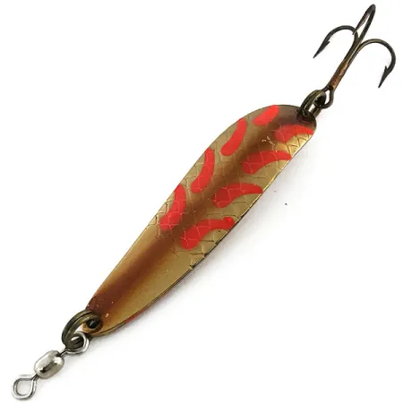 Brillando sobre una base clásica de latón, esta cucharilla de 6,5 cm (2 1/2") presenta el distintivo sello 'Die #4' que buscan los coleccionistas de Luhr Jensen. Los vibrantes patrones rojos en forma de llama revelan una ventaja táctica bajo la luz UV, donde brillan en un naranja intenso para mantener la visibilidad en las capas de agua más profundas. Con un peso de 14g (1/2oz), la densidad del señuelo está optimizada para lances de larga distancia desde la orilla o escolleras. Este ejemplar lleva el código de producto 9058 y mantiene un acabado impecable en su cuerpo metálico, con una calificación de estado de 5/5. Un giratorio de barril reforzado está unido al ojal para reducir la torsión de la línea durante la recogida, mientras que un anzuelo triple bronceado está sujeto por un robusto anilla de llavero en la cola. El grosor del cuerpo de latón es característico del compromiso de Luhr Jensen con la durabilidad, asegurando que la cucharilla mantenga su perfil durante recogidas rápidas o curricán.