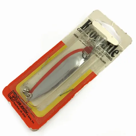 El niquelado sobre un cuerpo de 14 g (1/2 oz) define la esencia de este clásico de Luhr Jensen. Con una longitud de 6,5 cm (2 1/2"), el Krocodile Die #4 UV presenta un cuerpo troquelado grueso diseñado para mantener su perfil durante las presentaciones en aguas profundas. Mientras que la raya roja aparece como un detalle estándar a la luz del día, reacciona con un brillo naranja-rojo bajo la luz UV, un detalle técnico destinado a permanecer visible a medida que el espectro de luz se desvanece en las profundidades. Este ejemplar específico, identificado con el código de producto 6195, se conserva en su embalaje original de la fábrica de Hood River, Oregón. La cucharilla está sin usar y viene montada con sus anillas abiertas de alta resistencia y su anzuelo triple originales. Fabricado en los EE. UU., este señuelo fue diseñado para aplicaciones versátiles que incluyen lanzado, curricán y jigging, dirigido específicamente al salmón y otros depredadores de picada fuerte. El cartón trasero muestra el legado de Luhr Jensen & Sons, Inc., preservando el señuelo en su estado original de venta.