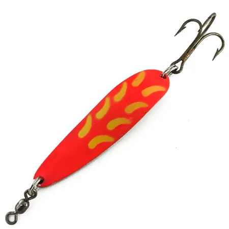 Con una longitud de 6,5 cm (2 1/2"), esta cucharilla de lance es un diseño clásico de metal pesado de la prestigiosa línea Luhr Jensen. El peso de 14 g (1/2 oz) le otorga una alta densidad relativa a su superficie, una característica distintiva de la serie Krocodile que le permite alcanzar rápidamente las zonas profundas donde suelen encontrarse salmones y truchas. Su perfil visual destaca por una cara superior en rojo-naranja neón vivo, decorada con detalles amarillos en forma de media luna, y una parte inferior de latón pulido. En condiciones de poca luz, el modelo 9080 revela sus propiedades de brillo UV, como se aprecia en la imagen secundaria, proporcionando una gran visibilidad en aguas turbias o durante el amanecer y el atardecer. En cuanto al hardware, cuenta con un emerillón de barril reforzado en la punta y un anzuelo triple afilado del número 4 en la cola. Este ejemplar está en excelente estado, con una calificación de 5/5, manteniendo el brillo original tanto en la pintura como en el latón. Muy apreciada para el lance desde escolleras o para curricán, el cuerpo más grueso y estrecho de la Krocodile está diseñado para alcanzar la máxima distancia incluso con viento en contra.