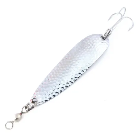 Con una longitud de 3 1/4" (8,5 cm), el cuerpo de calibre grueso de esta cucharilla está diseñado específicamente para alcanzar aguas profundas y maximizar la distancia de lanzado. El acabado de Níquel martillado en la cara convexa crea reflejos texturizados para captar la luz en diversas condiciones, mientras que el lado posterior liso muestra los sellos originales de Luhr Jensen y Krocodile de Hood River, Oregon. Con un peso de 1 oz (25 g), tiene la masa necesaria para mantener su posición en la columna de agua incluso con corrientes fuertes o viento. Catalogada bajo el código 10586, la cucharilla está en condición 5/5, con el chapado bien conservado y herrajes originales. Viene equipada con un anzuelo triple resistente y un esmerillón de barril integrado para evitar la torsión de la línea durante la recogida.