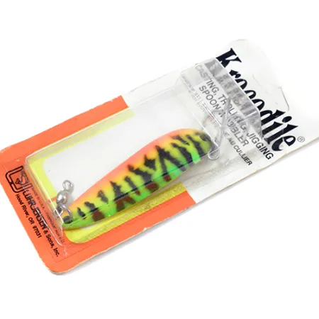 Con una longitud de 8,5 cm (3 1/4"), esta cucharilla ondulante reforzada es fundamental para los pescadores que buscan depredadores en aguas profundas. Las marcadas rayas de tigre negras sobre un degradado verde neón y naranja definen el patrón Fire Tiger de esta Krocodile Die #5, un acabado diseñado para la visibilidad en aguas turbias. Este ejemplar, con código de producto 1978, no ha sido usado y permanece en su blíster original de Luhr Jensen & Sons de Hood River, Oregón. Su cuerpo de metal de gran grosor está fabricado para ofrecer versatilidad, y el empaque original destaca explícitamente su uso para lanzado, curricán y jigging. Con un peso de 21 g (3/4 oz), el señuelo ofrece la densidad necesaria para alcanzar grandes distancias de lanzado con viento fuerte o para profundizar en la corriente. El herraje incluye un quitavueltas de barril en el morro para reducir la torsión de la línea y un robusto anilla abierta en la cola. La parte posterior del paquete conserva la etiqueta de inventario original, confirmando las especificaciones de color y tamaño. El blister transparente ha mantenido la pintura vibrante y las superficies metálicas brillantes.