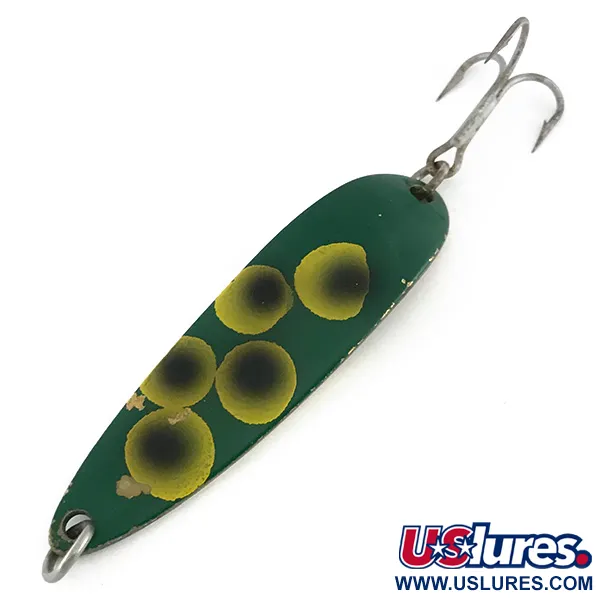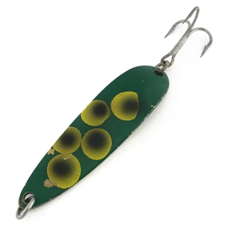 Una base de latón pulido otorga un peso considerable a esta cucharilla ondulante para lanzado y cacea, fabricada en Hood River, Oregón. Adornada con el clásico patrón "Frog" en su cara frontal, el señuelo presenta cinco distintivos puntos amarillos con centros oscuros sobre una pintura verde bosque profundo. El reverso revela el sello claro del fabricante "LUHR JENSEN" y el nombre "KROCODILE", junto con la pegatina de inventario original para el código de producto 8110. Con un peso de 1 oz (28 g), su cuerpo de metal grueso está diseñado para alcanzar distancias que las cucharillas más ligeras no pueden tocar. Su longitud de 3 1/4" (8,5 cm) se combina con un anzuelo triple reforzado asegurado por una anilla abierta sólida, mostrando un acabado muy bien conservado. Este ejemplar recibe una puntuación de 5/5 por sus superficies limpias y letras nítidas. El vientre de latón proporciona un destello natural en la columna de agua cuando se combina con el acabado superior verde de alto contraste durante las recogidas de largo alcance.