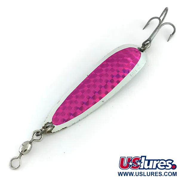 Con una longitud considerable de 3 1/4 pulgadas (8,5 cm), esta cucharilla ondulante de metal resistente cuenta con una llamativa cinta prismática rosa sobre un cuerpo de cromo reflectante. Esta Luhr Jensen Krocodile Die #5, identificada con el código de producto 8508, pesa 1 oz (25 g), una categoría de peso diseñada específicamente para ayudar a los pescadores a alcanzar peces en profundidad o realizar lances de larga distancia desde muelles y escolleras. El reverso de la cucharilla está claramente marcado con los sellos tradicionales de la marca, "KROCODILE" y "LUHR JENSEN", junto con su origen estadounidense. Tanto el esmerillón de barril montado en la parte superior como el anzuelo triple trasero están asegurados con anillas abiertas robustas, manteniendo la resistencia necesaria para grandes salmónidos. El patrón prismático de este ejemplar proporciona un despliegue de luz facetado y multidireccional que contrasta con el metal pulido del perímetro. Este señuelo se mantiene en excelente forma, con una calificación de estado de 5/5. El grabado en la parte posterior es profundo y legible, un detalle que los coleccionistas aprecian en estas clásicas cucharillas de lance.