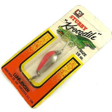 Níquel pulido combinado con una llamativa franja naranja fluorescente caracteriza el acabado de esta cucharilla ondulante vintage de 5 g (3/16 oz). Parte de la serie más escasa "Stubby", este modelo Krocodile UV (código de producto 6085) está diseñado con un recubrimiento especializado que reacciona a la luz ultravioleta, proporcionando un perfil de alta visibilidad en aguas tomadas o durante las transiciones de poca luz. Con una longitud de 3,3 cm (1 1/4"), el señuelo presenta la distintiva curva profunda típica del diseño "Lil' Kroc", adaptada para lances en corrientes o curricán. Este ejemplar no ha sido usado y permanece en su empaque original de Luhr Jensen, que destaca su legado de la era de producción en Hood River, Oregón, y Vancouver, B.C. Los herrajes de fábrica, incluyendo el anzuelo simple afilado y el esmerillón superior, se mantienen en perfectas condiciones.