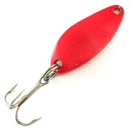 Un revestimiento rojo fluorescente distingue a esta cucharilla de 4 cm (1 1/2"), una variante específica conocida como Krocodile Stubby UV de Luhr Jensen. Con el código de producto 6350, este espécimen de 7 g (1/4 oz) presenta un perfil más compacto y poco común que la línea Krocodile estándar. Fabricado en EE. UU., el cuerpo metálico es adecuado para técnicas de lanzado y jigging. Bajo la luz UV, el acabado se transforma para revelar un brillo intenso, una característica técnica destinada específicamente a mejorar la visibilidad en aguas profundas o entornos de poca luz. El herraje se mantiene en excelente estado, con una anilla abierta segura conectada al anzuelo triple. Calificada con un estado 5/5, la pintura está limpia y vibrante en toda la superficie. Los coleccionistas suelen buscar estas versiones "Stubby" porque son menos comunes en las cajas de pesca modernas. La parte superior de la cucharilla incluye un orificio preperforado para el sedal.