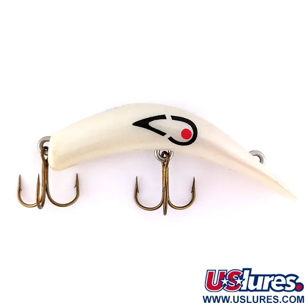 Con una longitud de 6 cm (2 1/4"), el perfil curvo distintivo de este señuelo vintage fabricado en EE. UU. cuenta con un acabado en Blanco Perlado. Este espécimen, identificado con el código 9990, presenta el reconocido gráfico de ojo estilizado en negro y rojo impreso en su lateral. Con un peso de 6 g (3/16 oz), su cuerpo en forma de banana está diseñado para pescar en aguas poco profundas de entre 0,3 m y 0,6 m (1 ft y 2 ft) de profundidad. Dos anzuelos triples de bronce se mantienen en óptimas condiciones, a juego con la calificación general de 5/5 del exterior del señuelo. El enganche de la línea está integrado en la parte superior de la cara inclinada, una característica de diseño tanto para lance como para curricán enfocada a especies como el lucio y el lucioperca. El brillo perlado conserva su lustre original en todo el cuerpo de plástico.
