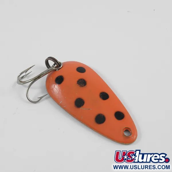 Adornada con un atrevido patrón de seis puntos negros sobre un vibrante acabado rojo anaranjado, esta cucharilla de fabricación canadiense hereda un diseño que ha sido un elemento básico en las cajas de pesca desde 1929. Con un peso de 1/2 oz (14 g), su cuerpo de latón en forma de lágrima mide 2" (5,0 cm) de largo, lo que la convierte en una opción versátil tanto para el lanzado como para el curricán. El reverso del señuelo presenta el clásico sello profundo del fabricante, que lo identifica como un modelo Len Thompson #00. El acabado de la pintura se mantiene notablemente nítido y, con una calificación de estado de 4/5, el ejemplar muestra solo ligeras señales de manipulación mientras mantiene una superficie de latón brillante y reflectante en el reverso. Viene equipada con un robusto anclaje y un anzuelo triple original, destinados a aprovechar la acción de bamboleo lento que caracteriza a esta imitación de pez pasto. Los coleccionistas reconocerán los herrajes y el sellado distintivos asociados al código de producto 2579.