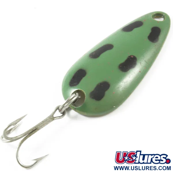 En la parte inferior de latón está claramente grabada la marca "LEN THOMPSON No. 00", que identifica a este clásico de fabricación canadiense. La cara superior presenta una base de color verde bosque mate decorada con siete puntos negros distintivos, un patrón utilizado a menudo para imitar anfibios o peces pasto. Con unas medidas de 5 cm (2") y un peso de 14 g (1/2 oz), la cucharilla está fabricada en latón macizo, un material que el fabricante utiliza desde 1929 para garantizar un equilibrio específico. Esta distribución del peso permite un movimiento de bamboleo lento durante la recogida. El montaje consta de un único anzuelo triple unido mediante un anilla abierta en la cola, mientras que en la punta afilada se encuentra el orificio para el sedal. Catalogado con el código de producto 3217, el ejemplar se encuentra en un estado 4/5, mostrando una pintura bien conservada en la parte superior y un acabado de latón brillante y limpio en el reverso. El lanzado o el curricán con esta cucharilla ondulante es un método tradicional para pescar lucios, salmones y truchas de lago.