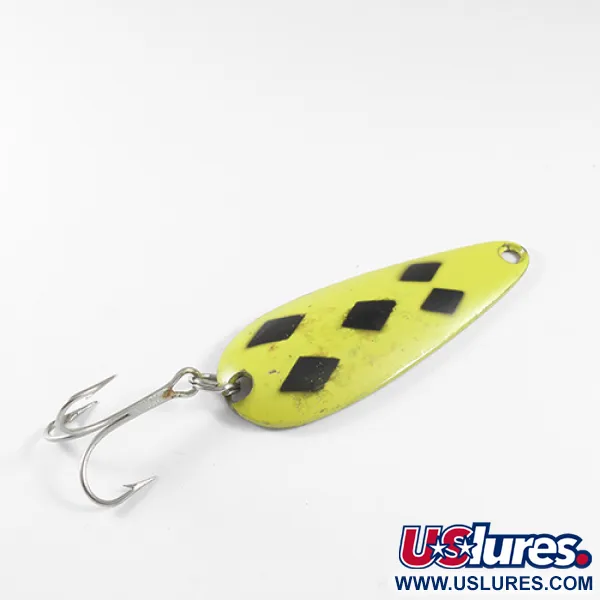 Cinco rombos negros dispuestos en el patrón clásico sobre un acabado amarillo vibrante definen la estética de esta cucharilla ondulante fabricada en Canadá. Con un peso de 3/4 oz (21 g) y una longitud de 2 3/4" (7 cm), este modelo de tamaño #1 proporciona un perfil significativo para pescar lucios o truchas de lago. La parte posterior con acabado en latón lleva estampado el nombre del fabricante, Len Thompson, cuya tradición de producción en la región se remonta a 1929. Este ejemplar, con el código de producto 1748, muestra ligeras señales de uso en la pintura y el metal, manteniendo un estado de conservación de 4/5. Un anzuelo triple de tono plateado está sujeto en la parte posterior mediante un fuerte anilla abierta, lo que la hace lista para el lance o el curricán. La curvatura específica del metal está diseñada para crear un movimiento de oscilación lento durante la recogida. La base de latón permanece visible en el reverso, ofreciendo un destello sutil que contrasta con la cara amarilla de alta visibilidad.
