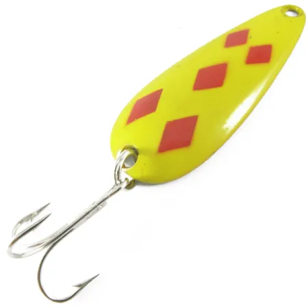 La construcción de latón macizo de 21 g (3/4 oz) convierte a este Len Thompson #1 de 7 cm (2 3/4") en un favorito de peso pesado para pescar lucios y truchas de lago. El acabado «Five of Diamonds» está aplicado con maestría, con cinco rombos rojos nítidos sobre un fondo amarillo vibrante. En el reverso, encontrará el clásico sello del fabricante estampado en la superficie de latón limpio. Este ejemplar en particular, identificado con el código de producto 3682, se encuentra en un estado 5/5, manteniendo un brillo intenso en la pintura y un resplandor vivo en el metal. Desde 1929, estas cucharillas de fabricación canadiense son famosas por su acción de balanceo lento que simula un pez herido durante el lanzado o el curricán. El señuelo está equipado con un robusto anzuelo triple, fijado de forma segura al extremo posterior para soportar la picada de un potente depredador.