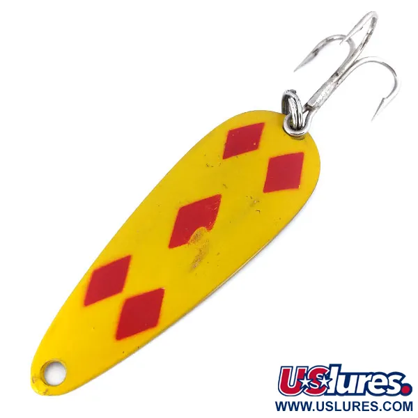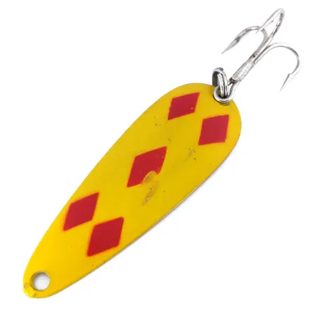 Con un peso exacto de 28 g (1 oz), esta cucharilla ondulante presenta el legendario esquema de color Five of Diamonds. El esmalte amarillo está decorado con cinco diamantes rojos, un patrón que ha definido la identidad de la marca desde 1929. El reverso de latón está grabado con "LEN THOMPSON NO. 2" y su origen canadiense. Este artículo, con código de producto 10774, mantiene un anzuelo triple plateado unido por una anilla abierta reforzada. Su estado es de 4/5, mostrando ligeras marcas superficiales de almacenamiento. El metal de gran calibre está diseñado para potenciar la característica acción de balanceo lento del señuelo al buscar depredadores en aguas profundas.