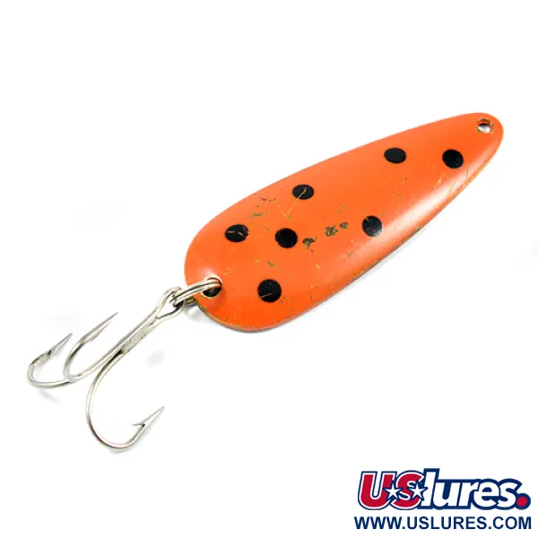 Con una longitud de 8 cm (3 1/4 pulgadas), este clásico de fabricación canadiense destaca por su intenso acabado en rojo anaranjado y su característico patrón de puntos negros. Grabado claramente en el reverso de latón, el sello "LEN THOMPSON NO 2" identifica un señuelo diseñado para la versatilidad, ya sea practicando curricán para trucha de lago o lanzando en zonas poco profundas. Este ejemplar, con un peso de 28 g (1 oz), lleva el código de producto 2243 y demuestra la dedicación de la marca al equilibrio. El señuelo se encuentra en un estado de conservación 4/5, presentando ligeras marcas superficiales y pequeñas pérdidas de pintura cerca de los bordes que le confieren el carácter propio de su tiempo en la caja de aparejos. Equipado con un robusto anzuelo triple plateado, el diseño de la cucharilla está pensado para un movimiento de balanceo lento que imita la natación de un pez pasto en apuros. El anillado se mantiene firme y funcional, listo para el próximo lance o para ocupar un lugar en una colección selecta.