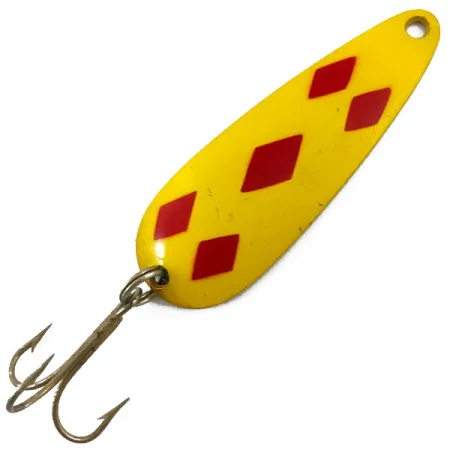 Cinco llamativos diamantes rojos sobre un acabado amarillo brillante marcan un diseño que ha sido un elemento básico en las cajas de aparejos desde que la empresa comenzó su producción en 1929. Con un peso de 28 g (1 oz), esta Len Thompson #2 (código de producto 4653) está construida con un grosor que favorece su característica acción de balanceo lento al recoger. El reverso de la cucharilla presenta un sello claro que la identifica como "LEN THOMPSON NO. 2", mostrando el metal base de color latón debajo. Con una calificación de estado de 5/5, la pintura permanece impecable y los componentes, incluido el anzuelo triple original, están bien conservados. Este ejemplar de 8 cm es un testimonio de la reputación de equilibrio de la marca, lo que la convierte en una opción fiable para el lance o el curricán en aguas profundas donde suelen habitar el salmón y la trucha steelhead.