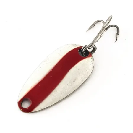 Claramente estampado en el reverso de color latón se encuentra la marca 'LEN THOMPSON NO. 6', que identifica el origen de esta pequeña cucharilla. Este señuelo de fabricación canadiense, con código de producto 11312, presenta un acabado blanco clásico acentuado por una llamativa franja roja diagonal en su cara frontal. Con una medida exacta de 2,5 cm (1") de largo y un peso ligero de 3,5 g (1/8 oz), la cucharilla está construida sobre una base de latón macizo. El herraje consiste en un único anzuelo triple de tono plateado sujeto en el extremo más ancho mediante una anilla abierta resistente. Calificada con una condición de 5/5, las superficies de esmalte y metal se mantienen limpias y cuidadas. Históricamente, estas cucharillas están equilibradas para un movimiento de balanceo lento, una técnica utilizada por los pescadores para imitar pequeños pececillos o peces pasto desde el inicio de la marca en 1929. Un orificio para el sedal está perfectamente perforado en el extremo estrecho de la cucharilla.