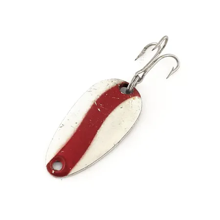 Una llamativa franja roja diagonal cruza la cara blanco crema de esta cucharilla compacta de 2,5 cm (1 pulgada). Con un peso de 3,5 g (1/8 oz), este hallazgo vintage lleva el código de producto 11497 y es un elemento básico en la línea Len Thompson. El reverso presenta un acabado en latón con un sello que lo identifica como modelo "NO. 0", a pesar de su designación de catálogo #6. Los pescadores confían en estas cucharillas por su característico bamboleo lento al lanzar o hacer curricán para especies como la trucha y peces de pan. Este ejemplar está en condición 5/5, mostrando un ligero desgaste superficial y finas grietas en el acabado de la pintura, junto con algo de oscurecimiento y oxidación en el latón y el triple original. El perfil de lágrima es un clásico de Len Thompson, un diseño producido desde 1929 para imitar a los pequeños peces pasto.