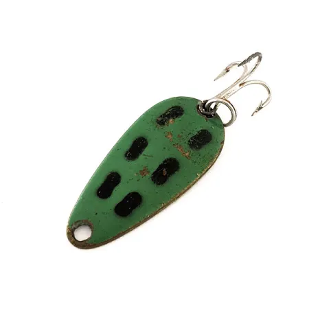 Con un vibrante diseño de Rana, esta cucharilla canadiense de 3,5 cm (1 1/2") está acabada con una parte superior de color verde hierba y distintivas manchas ovaladas negras. En el reverso de tono latón destaca la marca grabada "LEN THOMPSON NO 7", reflejo de su herencia de un fabricante esencial desde 1929. Con un peso de 5 g (3/16 oz), la cucharilla está diseñada para un movimiento de balanceo lento que imita a los peces pasto. El anzuelo triple plateado está sujeto mediante una anilla abierta fiable, y su estado general es un respetable 4/5, mostrando ligeras señales de uso. Bajo el código de producto 11545, su forma de lágrima y base de latón son rasgos clásicos de la gama Len Thompson.