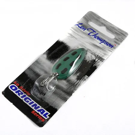 El patrón Green Frog con manchas oscuras y ovales define el acabado de esta cucharilla Len Thompson #8, un diseño clásico para la pesca en agua dulce de Norteamérica. Con un peso de 1/4 oz (7 g), este señuelo compacto de 4 cm (1 1/2") pertenece a la Original Series y está marcado con el código de producto 0741. Este ejemplar se mantiene sin usar en su embalaje original de fábrica, que detalla la larga trayectoria de la marca en Lacombe, Alberta, Canadá, desde 1929. El diseño facilita una acción de bamboleo lento durante la recogida o el curricán, destinada a imitar el movimiento de un pez pasto. En el reverso del cartón se aprecia la marca Thompson-Pallister Bait Co. Ltd. junto a la denominación específica 'No. 8 GF'. El señuelo está equipado con un anzuelo triple afilado, conservando sus componentes originales de fábrica.