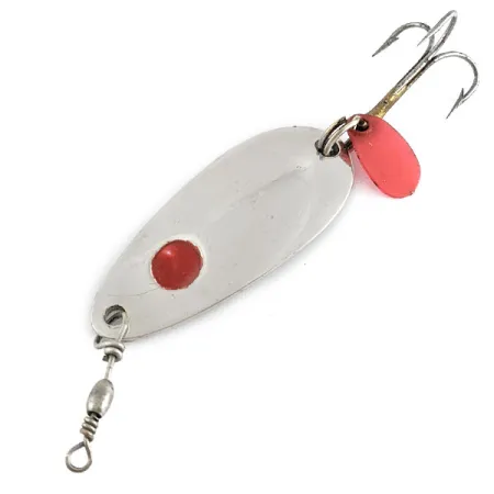 Con un acabado en niquelado brillante, esta cucharilla de 1 1/2" (4 cm) presenta un distintivo punto rojo pintado en su lado convexo. Con un peso de 1/4 oz (7 g), el ejemplar tiene grabado en el reverso "Les Davis 1/4 OZ. HOTROD", confirmando su origen estadounidense. Lleva el código de producto 21929 y viene montada con un anzuelo triple estándar y una pequeña placa atractora de plástico rojo en la anilla abierta trasera. Se incluye un quitavueltas de barril en la parte delantera para facilitar un movimiento fluido durante el lanzado o el curricán. Este ejemplar se encuentra en excelente estado, con una valoración de 5/5, conservando perfectamente el acabado niquelado y los detalles en rojo. Su cuerpo en forma de lágrima es un clásico del material de pesca americano de mediados de siglo, diseñado para ofrecer una gran visibilidad en diferentes condiciones de luz.
