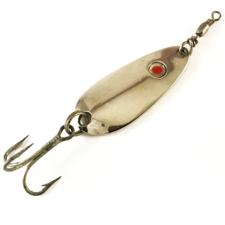 El niquelado proporciona un acabado clásico de alto brillo a esta cucharilla de 3,5 cm (1 1/2"), que sigue siendo una de las favoritas de los coleccionistas de la historia de la pesca de la costa oeste. En la parte posterior cóncava, el nombre 'Les Davis Hotrod' está claramente grabado junto a una marca de 1/6 oz, a pesar de que el peso estándar de catálogo para este código de producto 3605 es de 3/16 oz (5 g). Un punto rojo centrado en la cara frontal pulida cerca del enganche ofrece un estímulo visual simple pero eficaz contra el cuerpo metálico. Este ejemplar fabricado en EE. UU. está en un estado 5/5, con una superficie brillante y un quita vueltas con ligadura de alambre perfectamente intacto. El anzuelo triple original está unido mediante una robusta anilla abierta y no muestra signos de uso ni de paso del tiempo, lo que refleja su excelente estado de conservación desde antes de que la marca pasara a manos de Luhr Jensen.