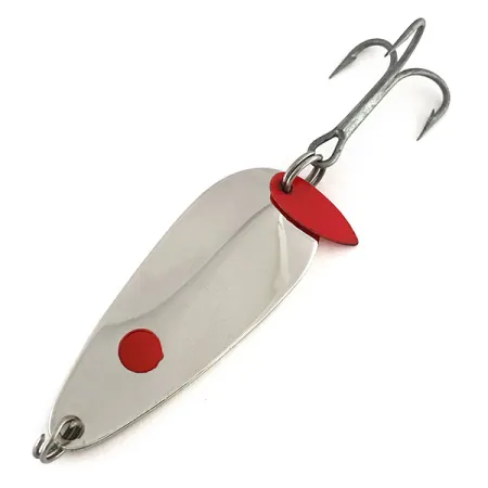 En el lado cóncavo de la hoja están estampados claramente los nombres Les Davis y Hotrod, lo que identifica a este modelo 8254 como un clásico de la historia de la pesca del Pacífico Noroeste. El acabado en níquel de alto brillo se acentúa con un punto rojo en la cara y una aleta de plástico roja característica unida al llavero trasero junto al anzuelo triple. Con un peso de 1/2 oz (14 g) y una medida de 2 1/4" (5,5 cm), el señuelo está fabricado sobre una base de latón macizo, un sello de la producción de calidad en la fábrica de Luhr Jensen en EE. UU. Este ejemplar se mantiene en excelentes condiciones (5/5), con una superficie reflectante y herrajes limpios y afilados. El texto "Hotrod" es nítido y legible, sin los signos de desgaste que suelen presentar las cucharillas de curricán antiguas.