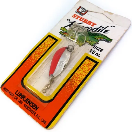 Con un peso de 1/8 oz (3,5 g), esta cucharilla presenta una marcada curvatura profunda que la distingue de los diseños estándar de hoja fina. El acabado destaca por un patrón bicolor: un lado en rojo sólido vibrante y el otro en cromo pulido altamente reflectante. Con una longitud de 1 1/4" (3,2 cm), la Lil' Kroc —a menudo llamada Krocodile Stubby— está equipada con un esmerillón de barril de alta resistencia en la parte delantera para gestionar la línea. Este ejemplar, identificado con el código de producto 10656, se encuentra sin usar en su blíster vintage original de Luhr Jensen, con la clásica ilustración del caimán. Su perfil compacto y ancho fue una elección de diseño específica del fabricante de Hood River, Oregón, para ofrecer una acción de lance y hundimiento distinta a la de sus cucharillas tradicionales más alargadas.