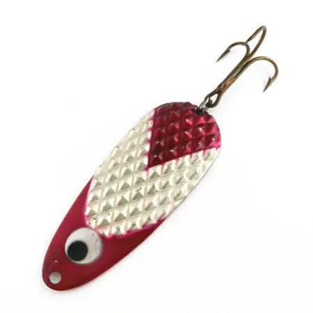 Un niquelado con textura de diamante sirve de base para esta cuchara Lindy Gator de 55g (2 oz). Con una longitud de 11,5 cm (4 1/2"), el señuelo presenta un llamativo acabado de pintura roja y blanca sobre un patrón de escamas troquelado. Un galón de color rojo intenso acentúa la zona de la cabeza, mientras que el resto del cuerpo transita hacia un centro blanco con los bordes inferiores flanqueados en rojo. Fabricado en EE. UU. por Lindy / Little Joe, este ejemplar lleva el código de producto 23586 e incluye un ojo móvil de gran tamaño para añadir contraste visual cerca del punto de enganche. Los componentes consisten en un robusto anzuelo triple sujeto mediante una anilla abierta en la parte posterior. Con un estado de conservación de 4/5, la cuchara muestra superficies metálicas brillantes y una pigmentación vibrante en todo su cuerpo.