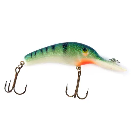 Con un peso exacto de 1/4 oz (7 g), este Lindy Shadling es un ejemplo por excelencia de la artesanía estadounidense de la década de 1980 de Lindy / Little Joe. El cuerpo de 5 cm (2") está acabado en un intenso patrón de Perca, que combina un lomo verde con purpurina con marcadas rayas verticales sobre un vientre de color crema. Debajo de la boca, un parche naranja vibrante proporciona un punto de contraste clásico para los peces que lo siguen. Este modelo específico, identificado con el código de producto 11104, se mantiene en condiciones 5/5, conservando su brillo original tanto en la pintura como en los herrajes. El babero de profundidad largo e integrado caracteriza el diseño del Shadling, que se convirtió en un elemento básico para los pescadores que buscan especies de aguas profundas. Los coleccionistas apreciarán la conservación del acabado brillante, que fue una firma estética de los señuelos Lindy de esta época.