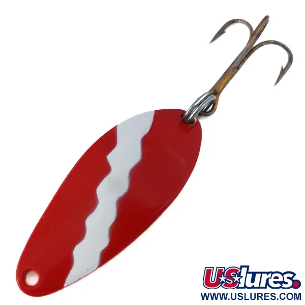 Con un peso de 1/4 oz (7 g), esta cucharilla ondulante clásica representa la era de producción original de Seneca Lure antes de que la marca fuera adquirida por Acme a principios de la década de 1980. La cara frontal está acabada con un patrón ondulado en rojo y blanco de alto contraste, un diseño característico para la visibilidad en diversas condiciones de luz. En el reverso, el metal de tono latón lleva estampado profundamente el marcado "LITTLE CLEO WIGL LURE SENECA LURE", lo que verifica sus raíces de fabricación estadounidense bajo el código de producto 10813. Con una medida de 1 1/2" (4 cm), el cuerpo está emparejado con un anzuelo triple desgastado unido mediante una anilla abierta robusta. Dada su calificación de estado 4/5, el señuelo se mantiene bien conservado, mostrando solo ligeros signos de su edad mientras mantiene las letras estampadas nítidas y la superficie pintada intacta. Este espécimen captura la calidad del material y la profundidad del estampado características de la producción original de la fábrica Seneca.