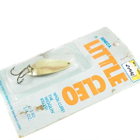 El baño de oro proporciona un acabado atemporal a esta cucharilla ondulante de 7g (1/4 oz), un peso que ha demostrado su eficacia durante décadas tanto en agua dulce como salada. Con una medida de 4 cm (1 1/2"), esta Seneca Little Cleo lleva el código de producto 2882 y representa una era crucial en la historia del material de pesca antes de la adquisición de la marca por parte de Acme a principios de los 80. Este ejemplar destaca especialmente por el grabado de una Hula Girl en la cara cóncava, un detalle que muchos pescadores veteranos consideran clave en la fama legendaria del señuelo antes de que el diseño se simplificara. El señuelo se presenta en estado sin usar, con una calificación de 6, y permanece sellado en su blíster vintage original. El dorso del cartón indica la ubicación de la división Seneca en Providence, RI, e incluye instrucciones específicas para el lanzado o la cacea de especies como trucha, salmón y lucio. El equipo incluye un anzuelo triple de fábrica, sin signos de edad ni desgaste.