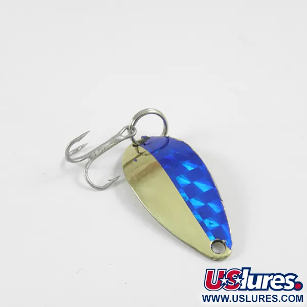 Con una longitud de 3 cm (1 1/4"), esta cucharilla Seneca presenta un llamativo acabado bicolor en su lado convexo. Una mitad conserva un brillo chapado en oro, mientras que la otra está cubierta con una vibrante cinta prismática de escamas azules que capta la luz de manera efectiva. Este modelo específico, código de producto 2972, representa la era original de Seneca del diseño antes de que la marca fuera adquirida por Acme. La parte posterior del señuelo está troquelada con el nombre «LITTLE CLEO», manteniendo líneas limpias y letras claras. Con un peso de 3,5 g (1/8 oz), la cucharilla tiene el tamaño ideal para lances de precisión con equipos ligeros. El montaje consta de una anilla abierta resistente y un anzuelo triple brillante. En condición 5/5, el acabado permanece excepcionalmente limpio tanto en el chapado en oro como en el detalle del prisma azul.