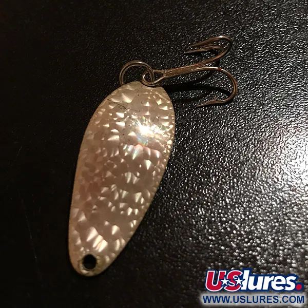 Escamas martilleadas con un patrón "Crystal" capturan la luz en la superficie de esta cucharilla vintage de 4 cm (1 1/2"). Estampada con la marca distintiva "Little Cleo Wigl-Lure A Seneca Lure", este señuelo representa la era de producción original antes de la adquisición de la marca por parte de Acme a principios de los años 80. El acabado Crystal (Golden Scale) proporciona una superficie profundamente texturizada diseñada para imitar la refracción de la luz en las escamas de los peces. Con un peso de 7 g (1/4 oz), la cucharilla está equipada con sus herrajes originales y un fuerte anzuelo triple, mostrando los estándares clásicos de fabricación de USA de la época. Identificado con el código de producto 11102, este ejemplar se encuentra en excelente estado, con una calificación de 5/5 por su acabado bien conservado y sus estampaciones metálicas nítidas. El diseño del cuerpo en forma de lágrima está lastrado específicamente para lances de larga distancia y curricán.