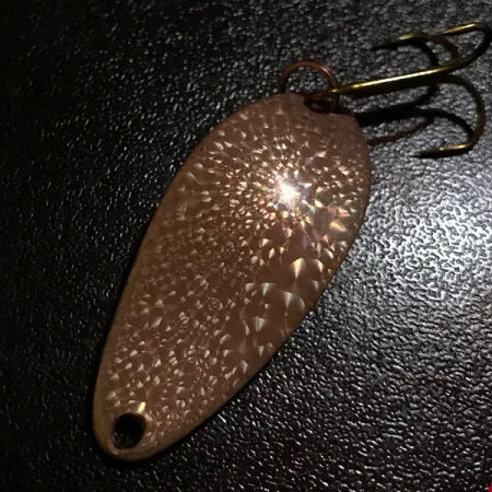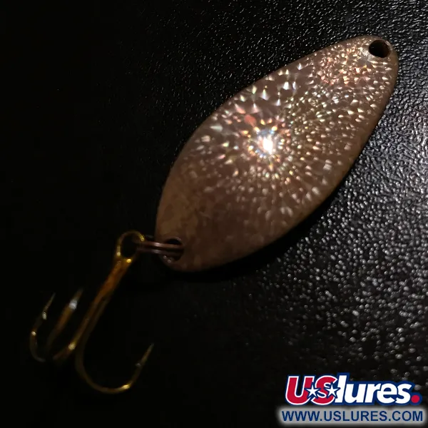 Estampada con la icónica marca « Little Cleo » en su reverso, esta cucharilla de 4 cm (1 1/2") presenta el raro acabado Crystal (Golden Scale), un patrón texturizado diseñado para captar y dispersar la luz. Con un peso de 7 g (1/4 oz), este ejemplar representa la artesanía de la Seneca Lure Co. original con sede en USA, fabricada antes de la adquisición de la marca por Acme a principios de los años 80. El efecto de « cristal roto » en la parte frontal del señuelo, identificado con el código de producto 8399, permanece notablemente claro y reflectante. El herraje consiste en una resistente anilla superior y un anzuelo triple afilado con acabado en bronce. Este señuelo en particular está en condición 5/5, mostrando superficies bien conservadas y un estampado nítido. La forma ancha y jorobada de la cucharilla es una característica distintiva del diseño Little Cleo, frecuentemente utilizada para lance y curricán.