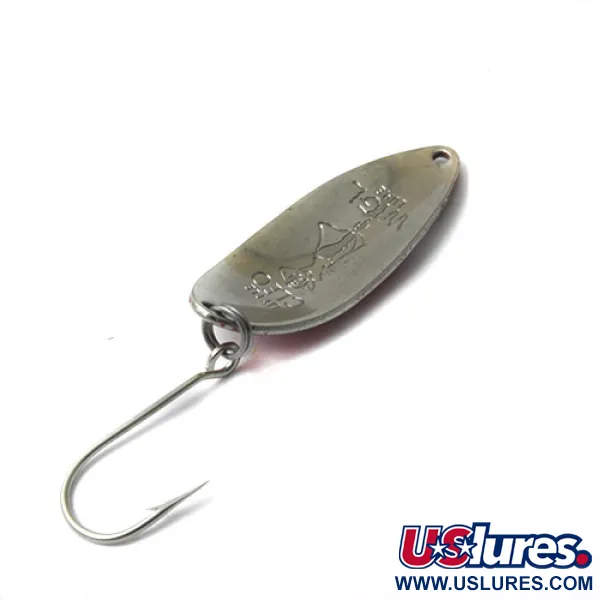 Con un peso de 1/2oz (14g), el perfil distintivo de esta cucharilla clásica es instantáneamente reconocible para cualquiera que haya pescado antes de la década de 1980. Este ejemplar en particular, con código de producto 0448, fue fabricado por la Seneca Lure Company en los EE. UU. antes de que la marca pasara a manos de Acme. La cara frontal muestra un vibrante acabado ondulado Rojo / Blanco, diseñado para proporcionar un alto contraste durante el lance. Al girar el señuelo se descubre la bailarina "Hula Girl" estampada en el reverso, una característica legendaria que muchos pescadores de la vieja escuela creen que superaba a las versiones posteriores de reverso liso. Con 2 1/4" (5,5 cm) de longitud, la construcción de metal pesado de la cucharilla sigue siendo sólida y fiable. Con una calificación de estado de 4/5, el señuelo muestra evidencias ligeras y honestas de su edad, mientras que los herrajes y la pintura se mantienen en excelente forma.