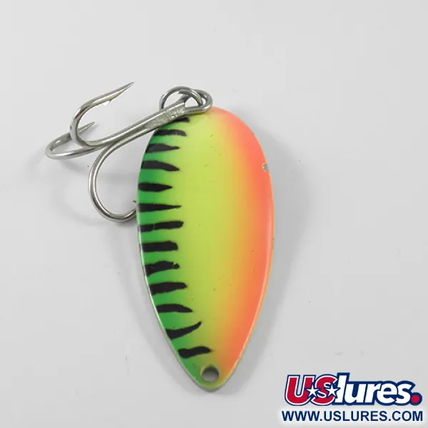 Tonos verdes y naranjas que se funden en un amarillo vibrante dominan el acabado Fire Tiger de esta cucharilla ondulante de 21 g (3/4 oz). Con una longitud de 6,5 cm (2 1/2"), este ejemplar es un producto de la empresa Seneca Lure, fabricado antes de que la marca fuera adquirida por Acme a principios de la década de 1980. Al dar la vuelta al señuelo, encontrará la icónica bailarina "Hula Girl" grabada en el reverso niquelado, una característica que desapareció de las versiones de producción moderna y sigue siendo un detalle muy valorado por los coleccionistas de artículos antiguos. Muchos pescadores experimentados sostienen que este diseño específico con la bailarina fue el secreto del éxito histórico del señuelo. El patrón frontal se acentúa con marcadas barras verticales negras que rompen el perfil fluorescente. Este señuelo, catalogado con el código 1454, muestra un acabado y unos componentes bien conservados, con una calificación de estado de 4/5. Incluye el anzuelo triple original de alta resistencia sujeto por una anilla abierta robusta, lo que refleja sus raíces de fabricación estadounidense.